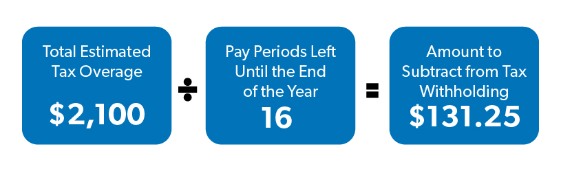 So, you’ve crunched the numbers and found you’ve been sending too much money to the IRS. Now what? Simply divide your estimated tax overpayment by the number of pay periods you have left before the end of the year to get your number.
